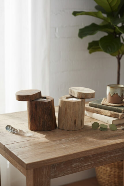 This handmade natural wooden candle comes in a beautifully crafted wooden container with an elegant lid, blending organic beauty with functional design.